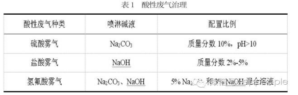 酸性廢氣的治理中,其中酸性廢氣凈化的主要方法是將酸性廢氣用三級(jí)堿液噴淋,再有煙囪排放。如處理典型酸往廢氣所配置的堿液如表1所示。用該方法吸收酸性廢氣時(shí),在真空抽氣栗上安裝密閉罩,將車間內(nèi)氣體排放,進(jìn)入裝有填料的噴淋塔。該工藝去除酸性廢氣的效率可達(dá)90%以上。