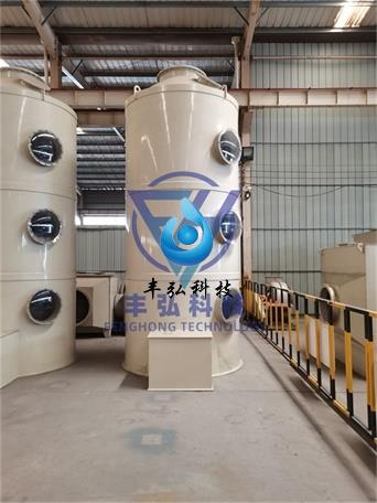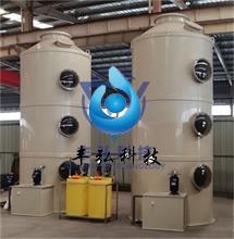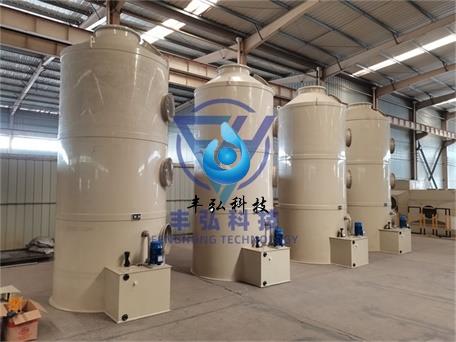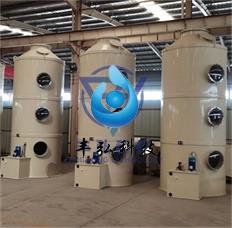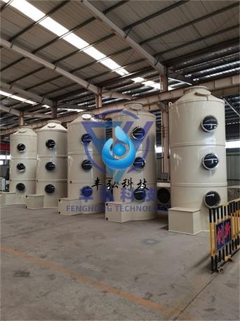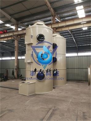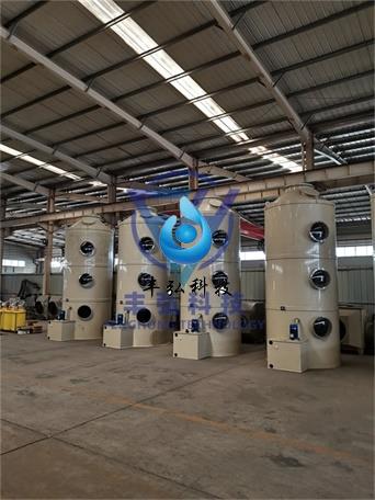 廢氣處理塔分單塔體和雙塔體。采用圓形塔體,用法蘭分段連接而成。具體由貯液箱、塔體、進風段、噴淋層、填料層、旋流除霧層、出風錐帽、觀檢孔等組成。