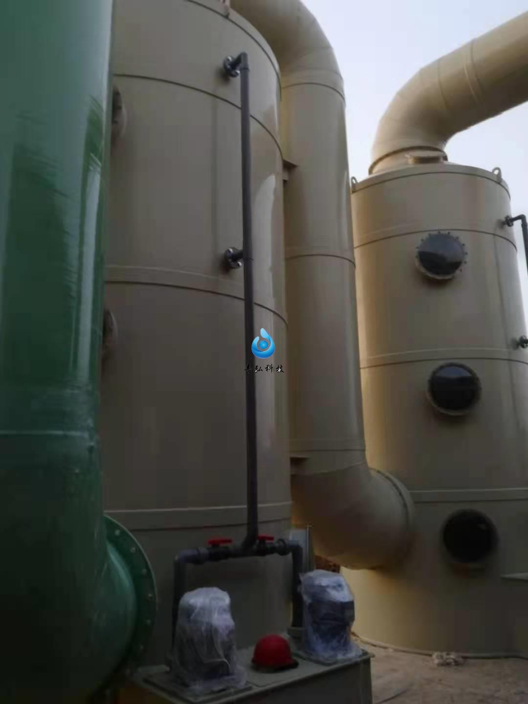 廢氣由加堿液的洗滌塔堿洗后進入加植物液的洗滌塔內,再經(jīng)過一級噴淋反沖洗,去除部分有害氣體成分并中和廢氣中難聞異味。