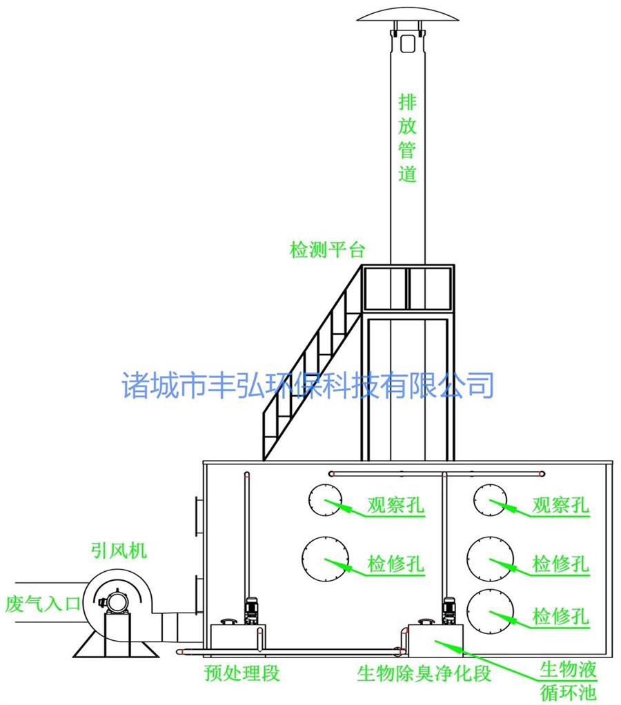 (3)進(jìn)入微生物細(xì)胞的惡臭成分子作為營養(yǎng)物質(zhì)為微生物所分解、利用,從而使污染物得以去除。微生物除臭是利用微生物細(xì)胞對(duì)惡臭物質(zhì)的吸附、吸收和降解功能,對(duì)臭氣進(jìn)行處理的一種工藝。生物濾池廢氣臭氣處理主要過程如下:通過收集管道,抽風(fēng)機(jī)將臭氣收集到生物濾池除臭裝置,臭氣經(jīng)過加濕器進(jìn)行加濕后,進(jìn)入生物濾池池體,后經(jīng)過填料微生物的吸附、吸收和降解,將臭氣成分去除。