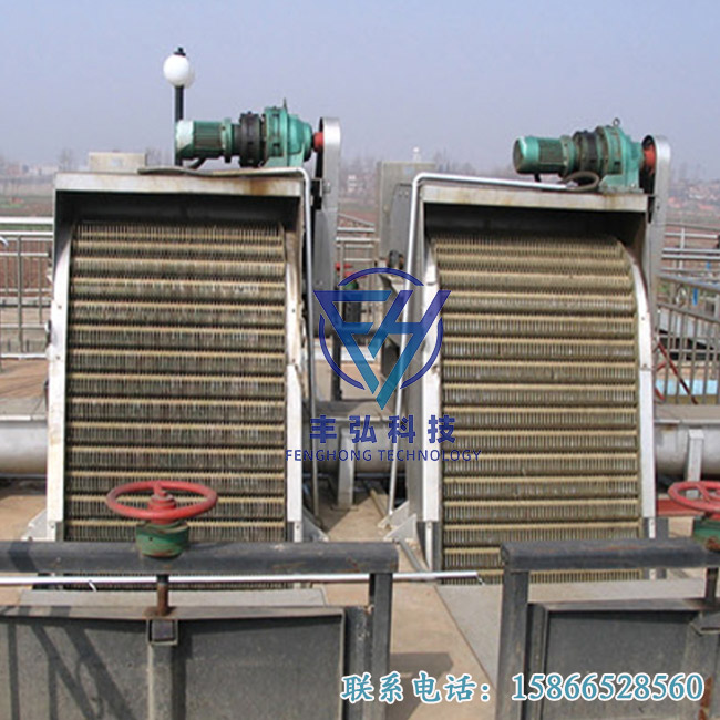 回轉耙式格柵除污機主要由驅動裝置、機架、主軸、柵條、托渣板、齒耙及牽引鏈組成。