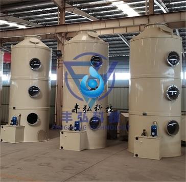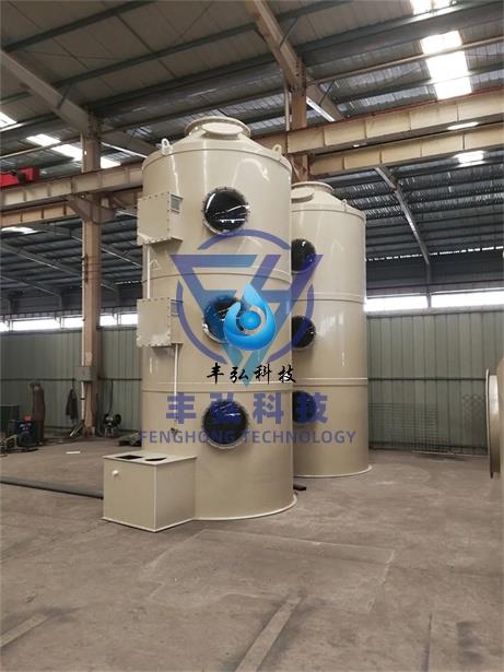 廢氣處理塔分單塔體和雙塔體。采用圓形塔體,用法蘭分段連接而成。具體由貯液箱、塔體、進風段、噴淋層、填料層、旋流除霧層、出風錐帽、觀檢孔等組成。